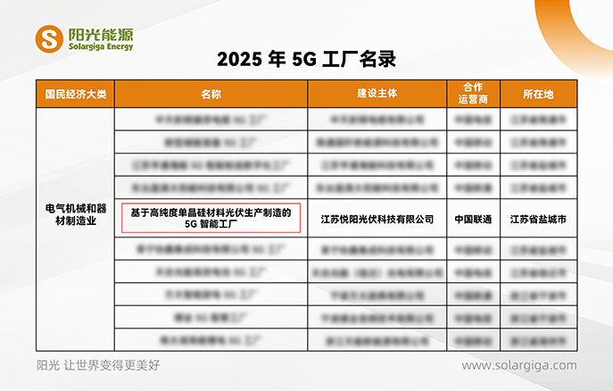 8 月 25 日,工業(yè)和信息化部公示了《2025年 5G 工廠名錄》,陽(yáng)光能源控股有限公司(以下簡(jiǎn)稱“陽(yáng)光能源”)旗下江蘇悅陽(yáng)光伏科技有限公司(以下簡(jiǎn)稱“悅陽(yáng)基地”)憑借其在光伏制造領(lǐng)域先進(jìn)的 5G 融合應(yīng)用成果,成功入選這一國(guó)家級(jí)名錄。